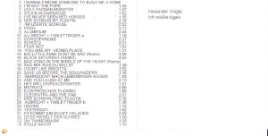 1. I wanna find me someone to be build me a home 2. I'm not he pope 3. ugly pacman monster 4. stuck in garbadge 5. I've never seen red horses 6. Der Schwan frisst Plastik 7. infizierte Scheiße 8. froh 9. Aluminium 10. Allbricht und Tablettinger (Folge 21) 11. Schizophrenie 12. Schizophrenie (Teil 2) 13. fear not (freie ev. Kirche) 14. you are my hiding place (freie ev. Kirche) 15. big little Anne 16. black saturday 17. bad sting in the middle of the heart 18. sag mir was Du willst 19. Dreadlock holiday (Britta) (Remix nach 10cc) 20. save us before the soulraiders 21. Sehnsucht nach lebendigen Augen 22. and you laugh at me 23. Hey Mr Lowpeacefighter 24. Matratz 25. Elektroshok fucking (feat. Fanta 4) 26. Cleopatra and the oak 27. Der Schwan frisst Plastik (Teil 2) 28. Allbricht und Tablettinger (Folge 22) 29. Undine 30. Yesterday (Beatles Cover) 31. Es kommt ein Schiff geladen (Weihnachtslied) 32. Leise rieselt der Schnee (Weihnachtslied) 33. Oh Tannenbaum (Weihnachtslied) 34. Stille Nacht (Weihnachtslied) |